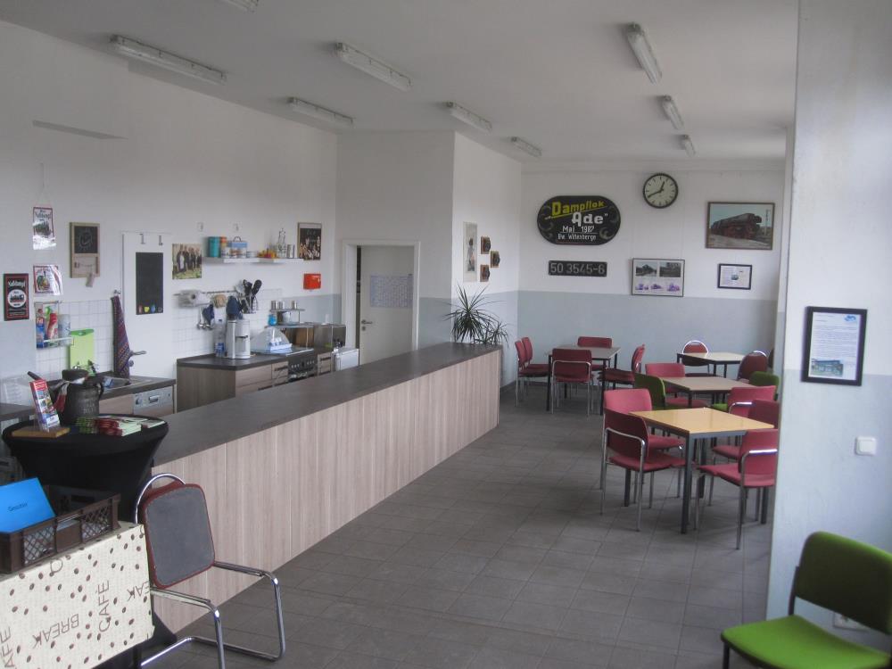 The room was previously divided into two: a wall, which had a large window, divided the room at the level of the projecting wall on the right-hand side of the picture. Behind this, the running foremen worked at arranging the day's tasks and allocating the locomotives for the day's programme. The footplate crews received their orders on the other side of the wall. Today the room is available for smaller functions for up to 50 people. Food, drinks and souvenirs can also be offered at functions.