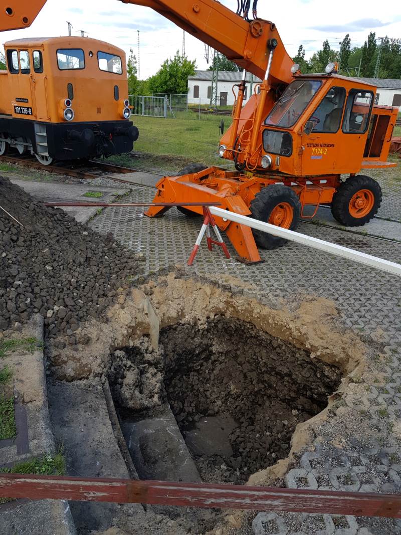 Since the aim is to rebuild engine shed 1 as far as possible one day and to install a turntable and corresponding shed tracks, preparatory work is now being done. So on Saturday members were able to do some archaeological work and uncover a part of the turntable pit which still exists but is currently filled up, so that the profile of the pit wall can be measured and the state of preservation can be checked. The necessary statics will be recalculated shortly.