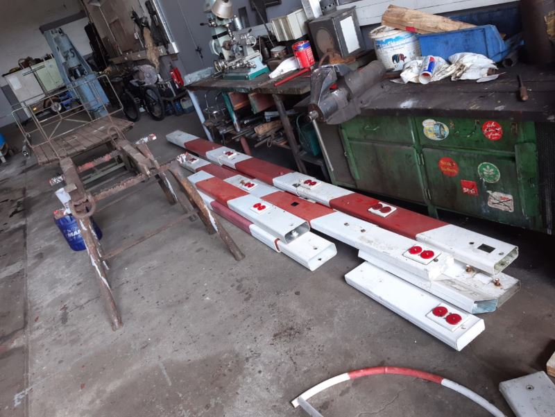 The next two pictures show a mounting block containing the electric motor for a barrier and some of the red and white painted barriers in our workshop.