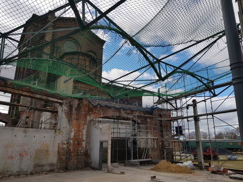 Dabei handelt es sich um die Wiederherstellung von Teilen des Daches des ehemaligen Lokschuppens 1. Hier wurden inzwischen die Mauerkronen durch eine Fachfirma saniert, in dem sie die maroden oberen Schichten abgetragen und mit den vorhandenen alten Ziegeln neu aufgemauert haben. Weiterhin wurde von außen unsichtbar ein Stahlbetonringanker eingebaut, welcher sicher die Lasten der neuen Dacheindeckung aufnehmen kann.