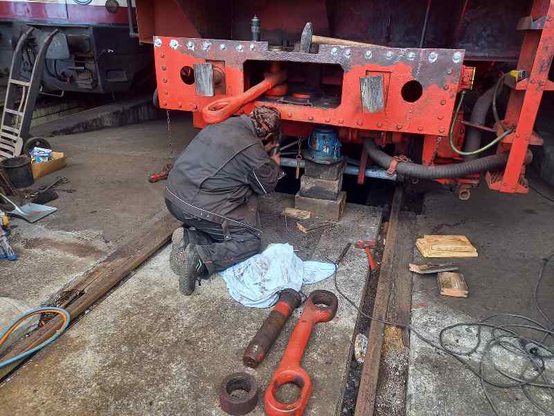 Am vergangenen Samstag konzentrierten sich einige Aktive auf die Fertigstellung des Tenders unserer Dampflok 50 3570. Hier waren insbesondere die sogenannten Kuppeleisen zu begutachten, welche den Tender mit der eigentlichen Lokomotive verbinden. Dabei handelt es sich um insgesamt drei ungefähr beindicke Metallstangen, die am Tender und der Lokomotive befestigt sind. Diese mussten ausgebaut, untersucht und neu lackiert werden. Das war ein hartes Stück Arbeit, weil die Bolzen, welche die Kuppeleisen im Tender halten, schon seit Jahren nicht mehr bewegt und entsprechend festgerostet waren. Um sie zu lösen, brauchte es viel Wärme aus dem Schweißbrenner und mehr oder weniger dezente Schläge mit dem Vorschlaghammer. Schließlich konnten die jeweils rund 100 Kilo schweren Kuppeleisen ausgebaut werden.