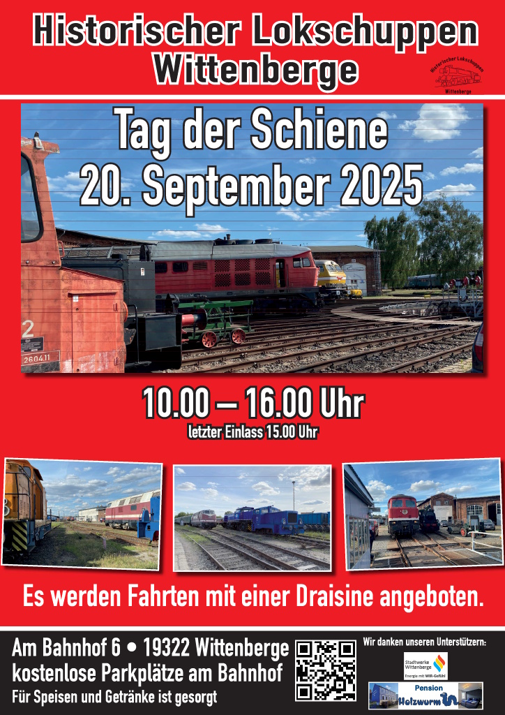 Am Samstag, den 20. September, wird zudem bundesweit der "Tag der Schiene" begangen, an dem viele Eisenbahnunternehmen und -museen ihre Arbeit vorstellen. So werden auch wir an diesem Tag zwischen 10 und 16 Uhr für Sie zur Verfügung stehen. Ab 17 Uhr findet ein Konzert im Lokschuppen statt, das Ihnen klassische Musik in Form von Werken von Händel, Haydn und Mozart kredenzt. Zum ersten Mal wird in diesem Rahmen die besondere Kulisse des Lokschuppens auch für einen Programmbeitrag der Ballettgruppe der Kreismusikschule genutzt.