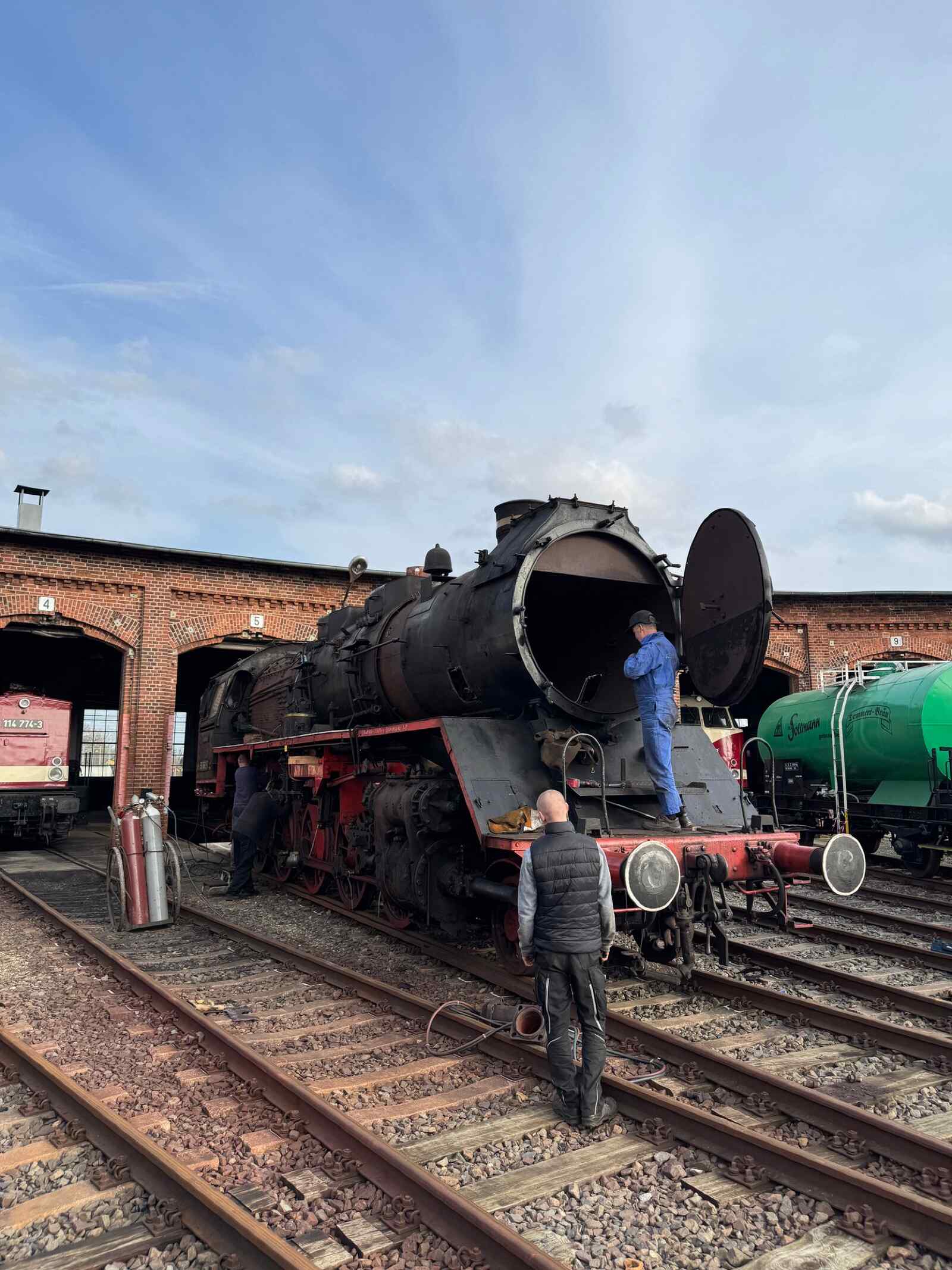 Arbeiten an unserer Dampflok 50 3682 am 3.4.2026. Das Führerhaus wird entfernt, um demnächst den Kessel der Lok abheben zu können.