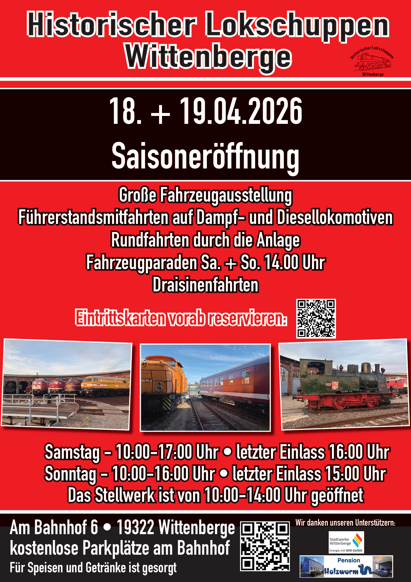 am Wochenende des 18. und 19. April 2026 drehen sich wieder die Räder in Wittenberge. Aus diesem Grund begrüßen wir alle großen und kleinen Eisenbahnfreunde zu unserer Veranstaltung Frühjahrsdampf 2026 im Historischen Lokschuppen. Dabei wird unsere Dampflok Emma natürlich wieder im Einsatz sein und mit ihren modernen Schwestern von der Diesellokfraktion um die Wette eifern.